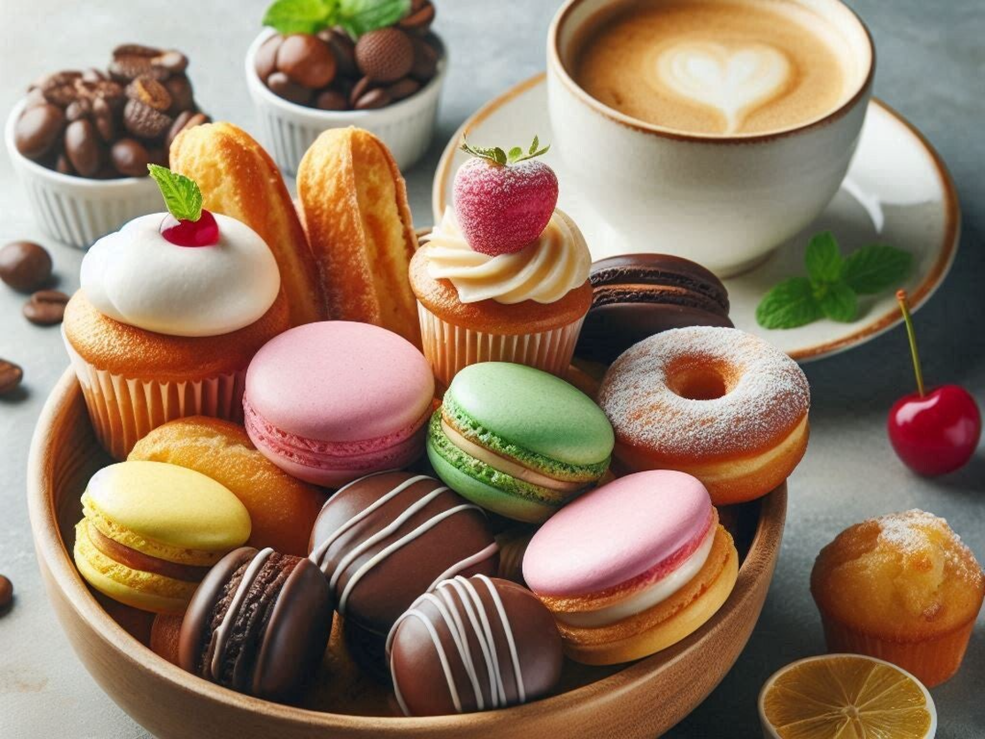 Schaal gevuld met macarons, petit fours, mini donuts en mini muffins.