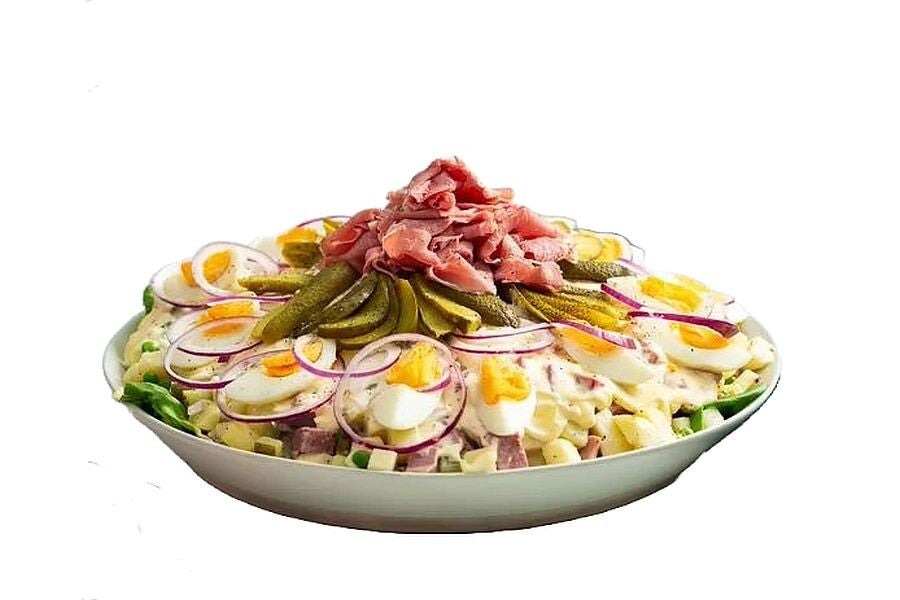 Ontdek pure culinaire verrukking met onze Ambachtelijke Vleessalade. Met zorg bereid, combineert deze heerlijke mix ham, salami, romig gevulde eitjes en een verfijnde garnering. Een festijn voor uw smaakpapillen. Geleverd op handige wegwerpschalen.