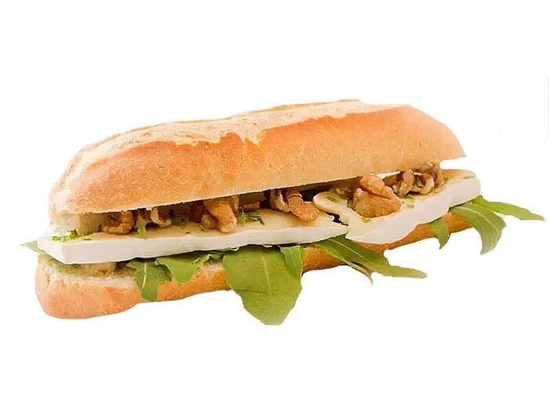 Broodje belegd met brie, komkommer, honing en walnoot.