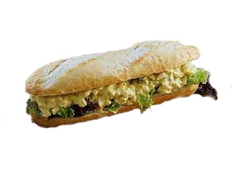 Broodje belegd met heerlijke eiersalade, kipfilet, kaas, sla, komkommer, bacon en saus.